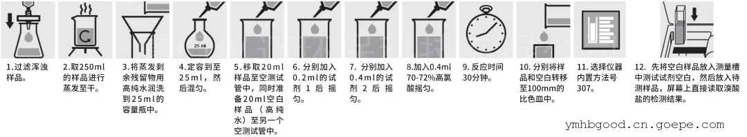 采用分光光度法原理,Prove600 plus實(shí)驗(yàn)室多參數(shù)水質(zhì)分析儀已經(jīng)內(nèi)置溴酸鹽檢測(cè)標(biāo)準(zhǔn)曲線,您只需進(jìn)行簡(jiǎn)單的水樣預(yù)處理即可開(kāi)始快速測(cè)試。該方法基于3,3二甲基萘啶與碘化物和溴酸鹽的化學(xué)反應(yīng)產(chǎn)生紅色色團(tuán),然后測(cè)定在550nm處的吸光度得出樣品中溴酸鹽的含量。此方法的*低檢測(cè)范圍為0.5–20μg/l(準(zhǔn)確度:± 0.5 μg/l)。測(cè)試步驟簡(jiǎn)介: