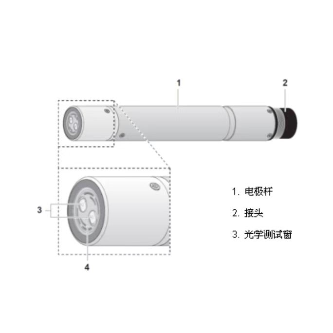 Note: 當(dāng)測試介質(zhì)溫度超過40°C時(shí)電極的超聲波清洗系統(tǒng)自動(dòng)關(guān)閉,當(dāng)溫度降低到40°C以下時(shí),該系統(tǒng)又自動(dòng)重新啟動(dòng)。該功能可防止電極過熱,如在電極*小浸入深度未滿足時(shí)。機(jī)械構(gòu)造 光學(xué)鏡片:藍(lán)寶石; 電極本體:V4A不銹鋼1.4571; 防護(hù)等級(jí):IP68 耐壓 *大10巴(含傳感器連接電纜) 插入深度 *小7cm,*大15m 功耗 1.5 W 尺寸 365×40 mm(長×直徑),不包括IQ電纜SACIQ 重量 約990 g 六、訂貨信息