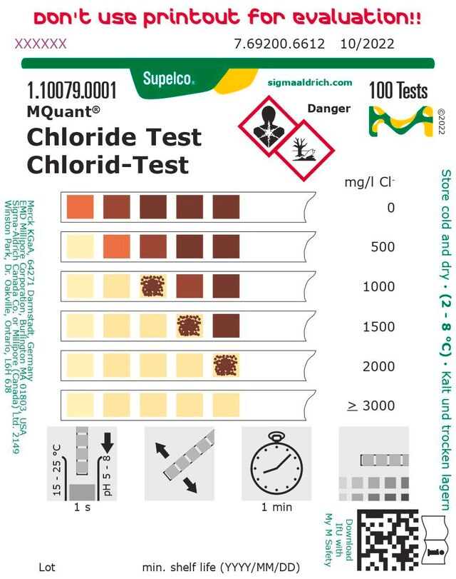 | | 用途:測定所有天然水體中的氯離子 | | 類型:半定量測試 | | 儲存溫度: 2-8°C | |